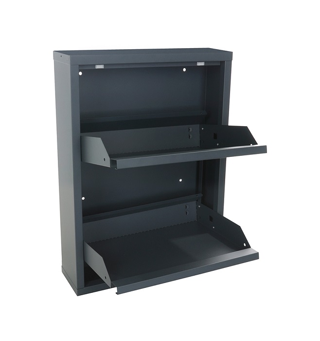 Обувница Практик ОМ-2 предназначена для хранения обуви. Обувница состоит из двух отделений, каждое отделение вмещает 2 пары обуви (до 43 размера). Изготовлена из стали, поставляется в собранном виде. Цвет: графит гладкий. Тип покрытия: порошковое