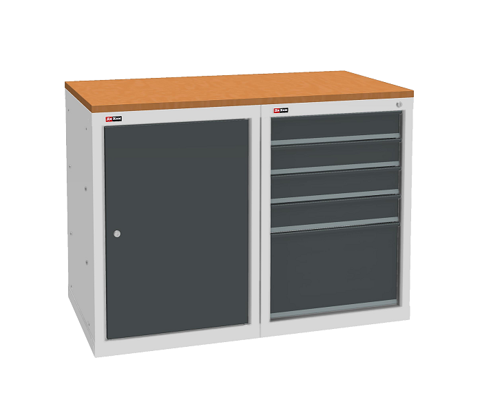 Цвет верстака: серый Ral 7038, лицевая панель ящиков/дверей антрацит Ral 7016. Тип покрытия: эпоксидная порошковая краска. Поставляется в разобранном виде