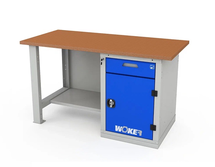 В комплектацию верстака входит: столешница Woker 1500, опора стационарная Woker (нерегулируемая), тумба Woker 01, полка/стенка Woker. Столешница выполнена из шлифованной березовой многослойной фанеры толщиной 30 мм. Снаружи фанера обработана влагостойким антисептиком цвета "красное дерево", что придает фанере повышенную влагостойкость и более темный цвет. Опора изготовлена из цельногнутого стального профиля толщиной 1,5 мм, шириной 80 мм. Полка/стенка выполнена из стального листа толщиной 1 мм. Выдерживает нагрузку -30 кг. Тумба Woker 02 имеет одну регулируемую по высоте полку с шагом 50 мм. Полка тумбы установлена на стальные салазки, которые позволяют выдвигать полку на себя на 70% для облегчения разгрузки/погрузки. Ящик комплектуется противоскользящим ковриком и набором наклеек с пиктограммами для маркировки содержимого ящика. Полезный размер ящика: (ШхГ) 459х612 мм. Дверь тумбы закрывается на цилиндрический ключевой замок со стальной поворотной ручкой, секретность замка 2000 комбинаций. Открывание двери на 180 градусов.